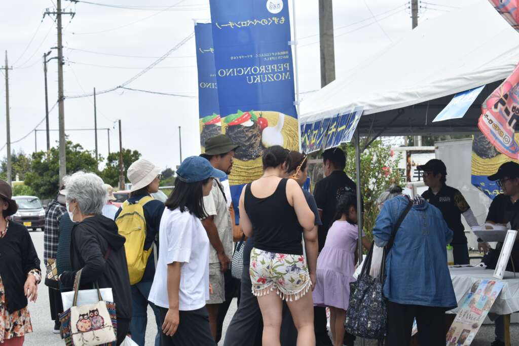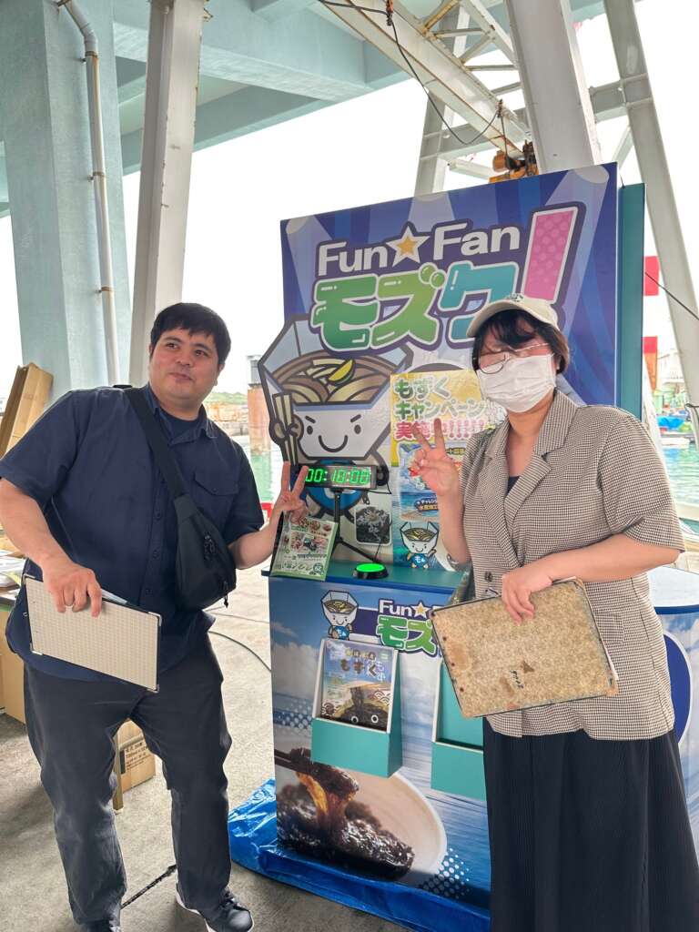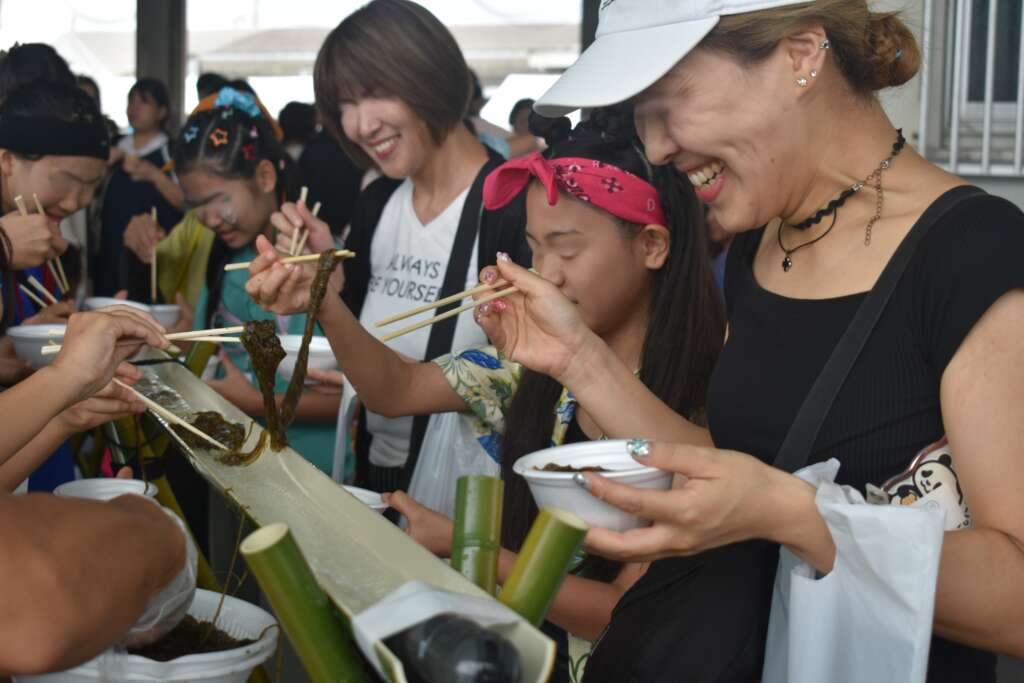 地元、勝連の海人が美しい海で育てた新鮮なモズクを「もずくそうめん流し」として提供。冷え冷えのモズクを頬張る来場者の皆様の笑顔が、とても印象的な一日でした!